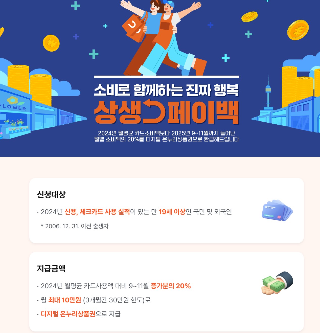 우선 상생페이백 제도가 시행된다. 지난해 월평균 소비 금액 대비 올해 9월부터 11월까지 소비 금액이 증가하면, 증가분의 20%를 디지털 온누리상품권으로 환급받을 수 있다. 월 최대 10만 원까지 환급 가능해 소비자는 혜택을 얻고, 지역 상권은 자연스럽게 매출이 늘어나는 구조가 마련된다.
