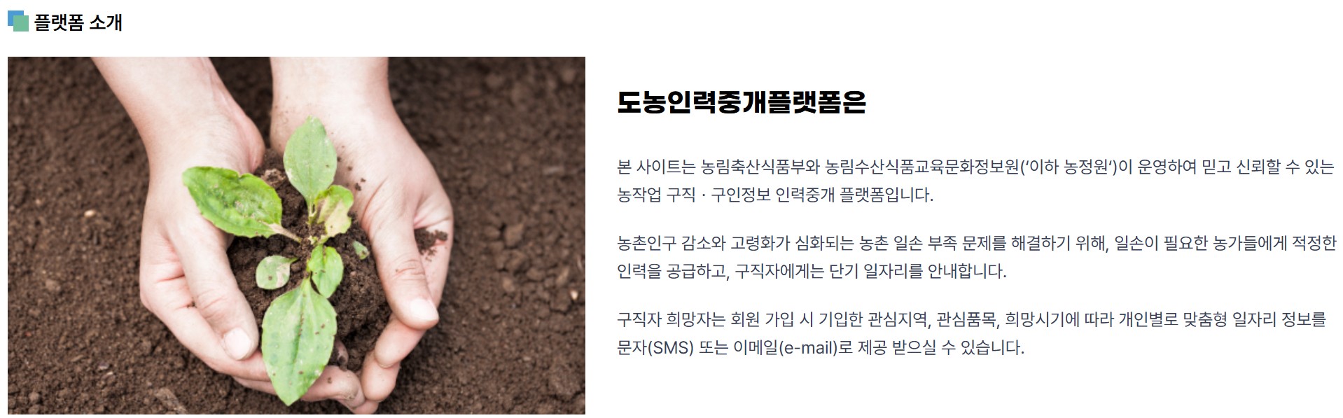 도농인력중개플랫폼은 농작업 구인·구직을 온라인으로 연결하는 종합적인 매개체로서 2020년대 초반부터 본격적으로 운영되었습니다.
