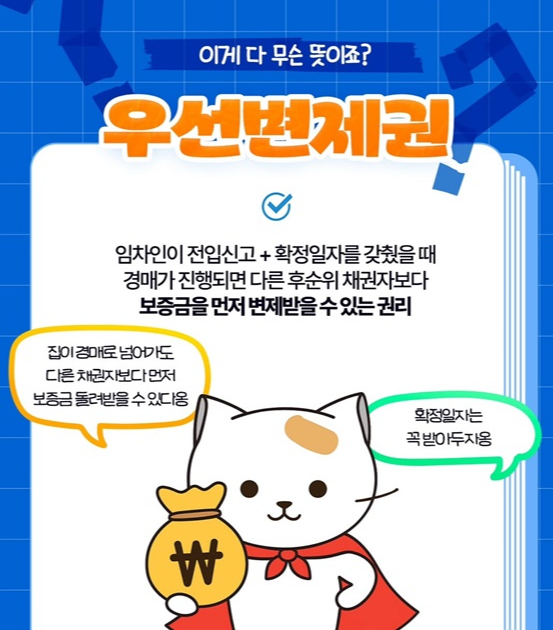 우선변제권은 세입자가 전입신고와 확정일자를 모두 갖췄을 때 확보할 수 있는 권리입니다. 주택이 경매로 넘어가더라도 다른 사람보다 먼저 보증금을 변제받을 수 있는 장치입니다.