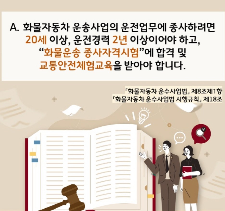 이러한 조건을 모두 충족한 경우 필기시험에 응시할 수 있으며, 합격 후에는 화물운송 종사자 교육을 이수해야 최종적으로 자격증이 발급됩니다. 이처럼 자격증 취득 과정은 단순하지 않으며, 체계적이고 단계적인 절차를 거쳐야만 최종적인 자격을 얻을 수 있습니다.