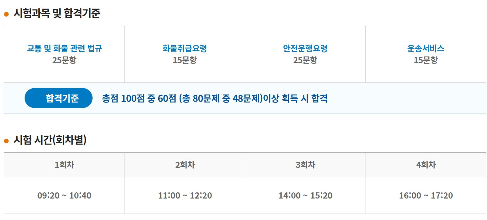 화물운송 자격시험은 필기시험과 합격자 교육으로 나뉘며, 필기시험은 총 네 과목으로 구성되어 있습니다.