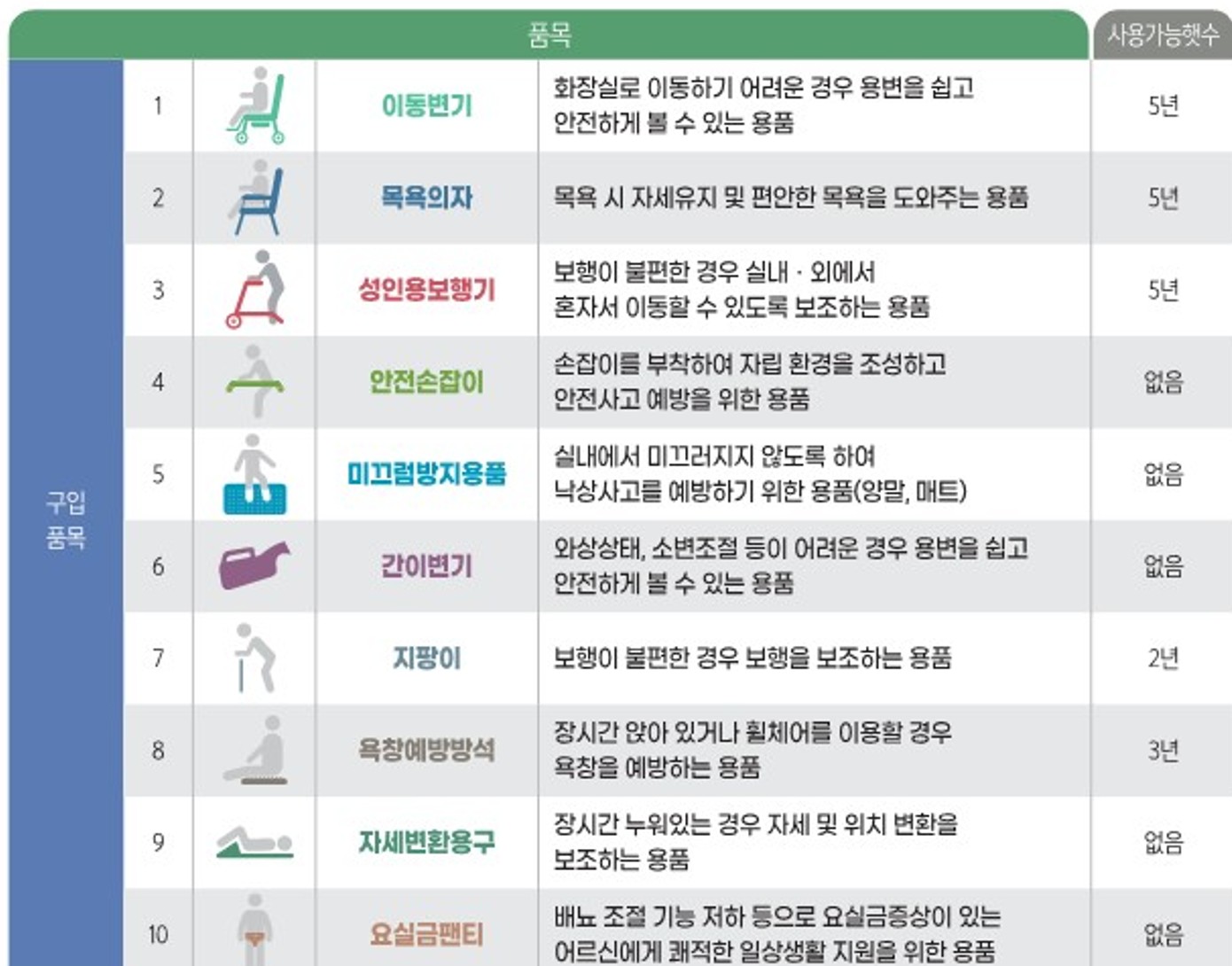 구입 가능한 품목(어르신의 안전과 편의를 돕는 생활지원용품)