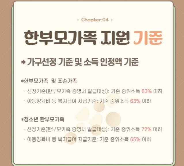 소득·재산 기준: 기준 중위소득 63% 이하 가정이 주요 지원 대상.