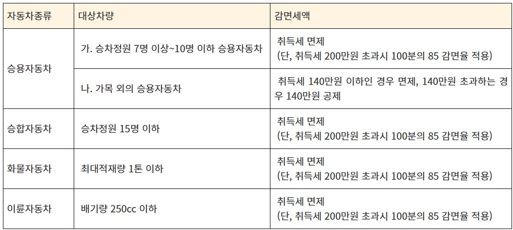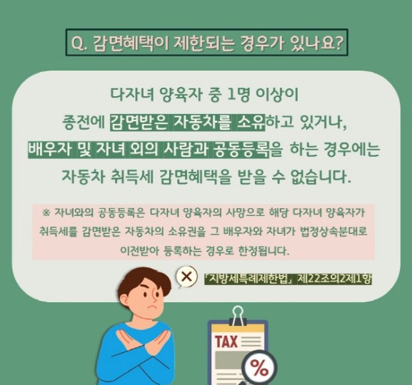 - 3자녀 이상 가구: 자동차 취득세 100% 전액 면제.