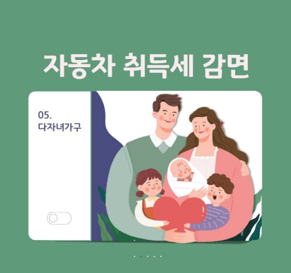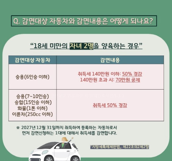 - 2자녀 가구: 자동차 취득세 50% 감면.