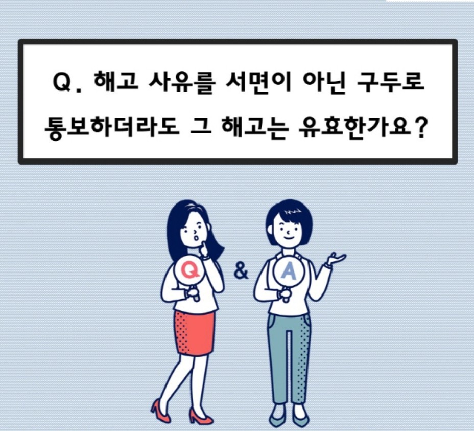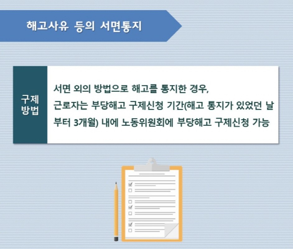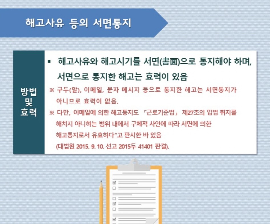 따라서 해고 사유와 해고일이 구체적으로 기재된 문서로 전달되어야 합니다.